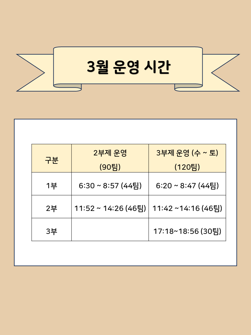 | 3¿ù ¿î¿µ ½Ã°£ ¾È³» | °ü¸®ÀÚ | |||